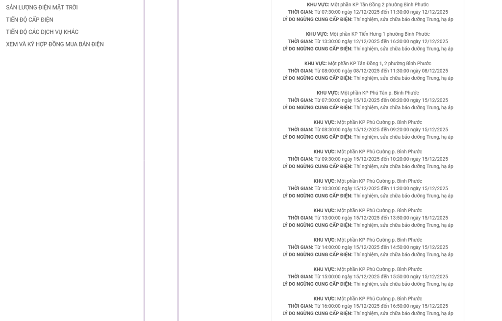 Cập nhật mới nhất lịch cắt điện cụ thể tại Đồng Nai từ website của Tổng công ty Điện lực miền Nam (EVNSPC), Công ty TNHH MTV Điện lực Đồng Nai vào ngày mai 12/12.