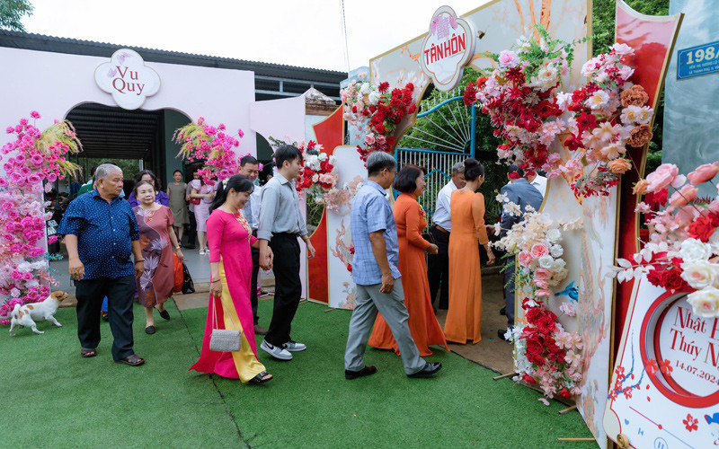 Cặp đôi tổ chức đám cưới vào tháng 7/2024. Con ngõ khá nhỏ, không gian dựng rạp cưới hạn chế nên hai bên gia đình quyết định đãi tiệc vào 2 ngày khác nhau. Hơn nữa, làm cỗ khác ngày cũng tránh được việc khách nhầm lẫn giữa 2 tiệc cưới.