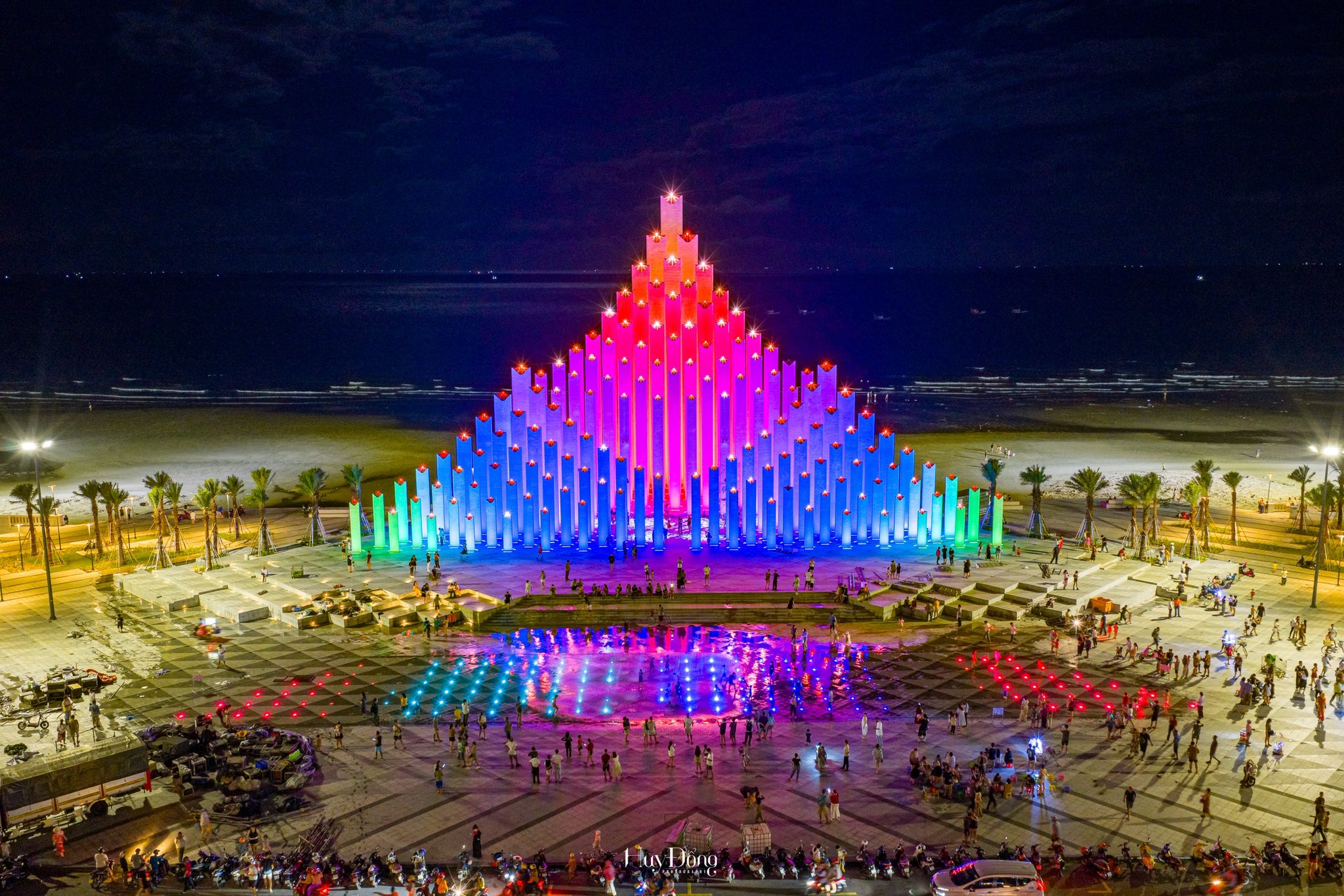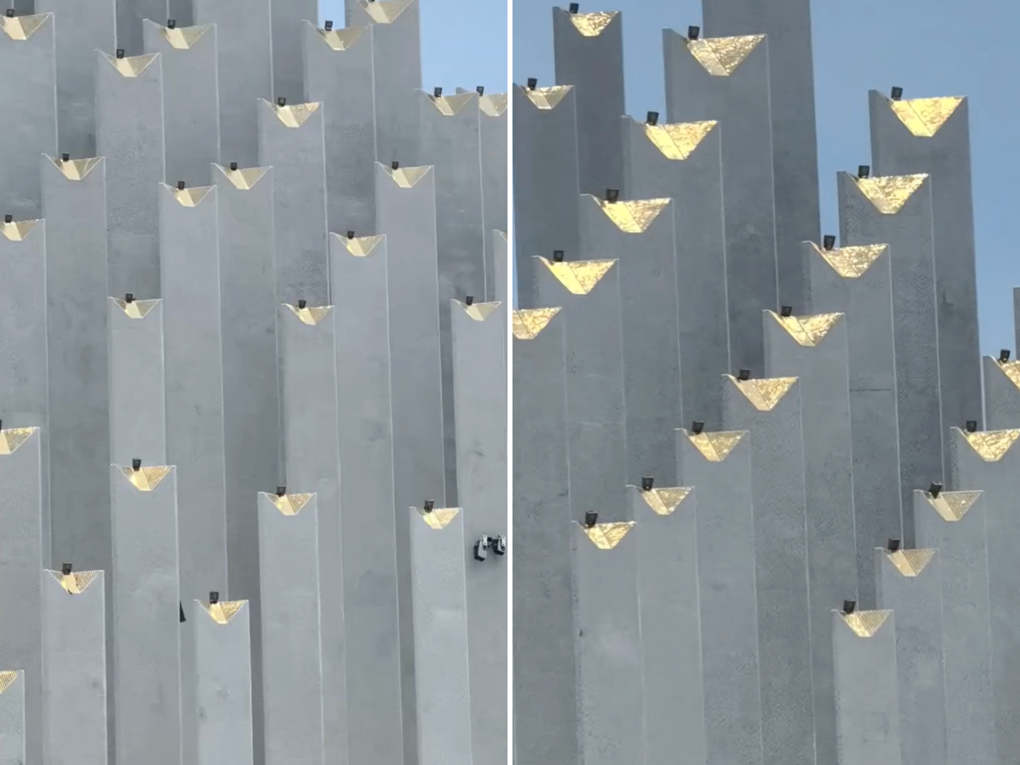 Điểm đặc biệt tạo nên hiệu ứng thị giác mạnh mẽ chính là bề mặt tháp được ốp bằng gạch mosaic phản chiếu ánh sáng. Điều này tạo ra một hiệu ứng rực rỡ, lấp lánh vào ban ngày như cặp đôi đã tranh cãi trong video. Khi đêm đến, hệ thống đèn led của công trình sẽ được bật lên vô cùng nổi bật. Nơi này được nhiều du khách đến check-in vì mỗi vị trí đứng và góc chụp khác nhau đều có thể tạo ra những bức ảnh với hiệu ứng thị giác vô cùng độc đáo.