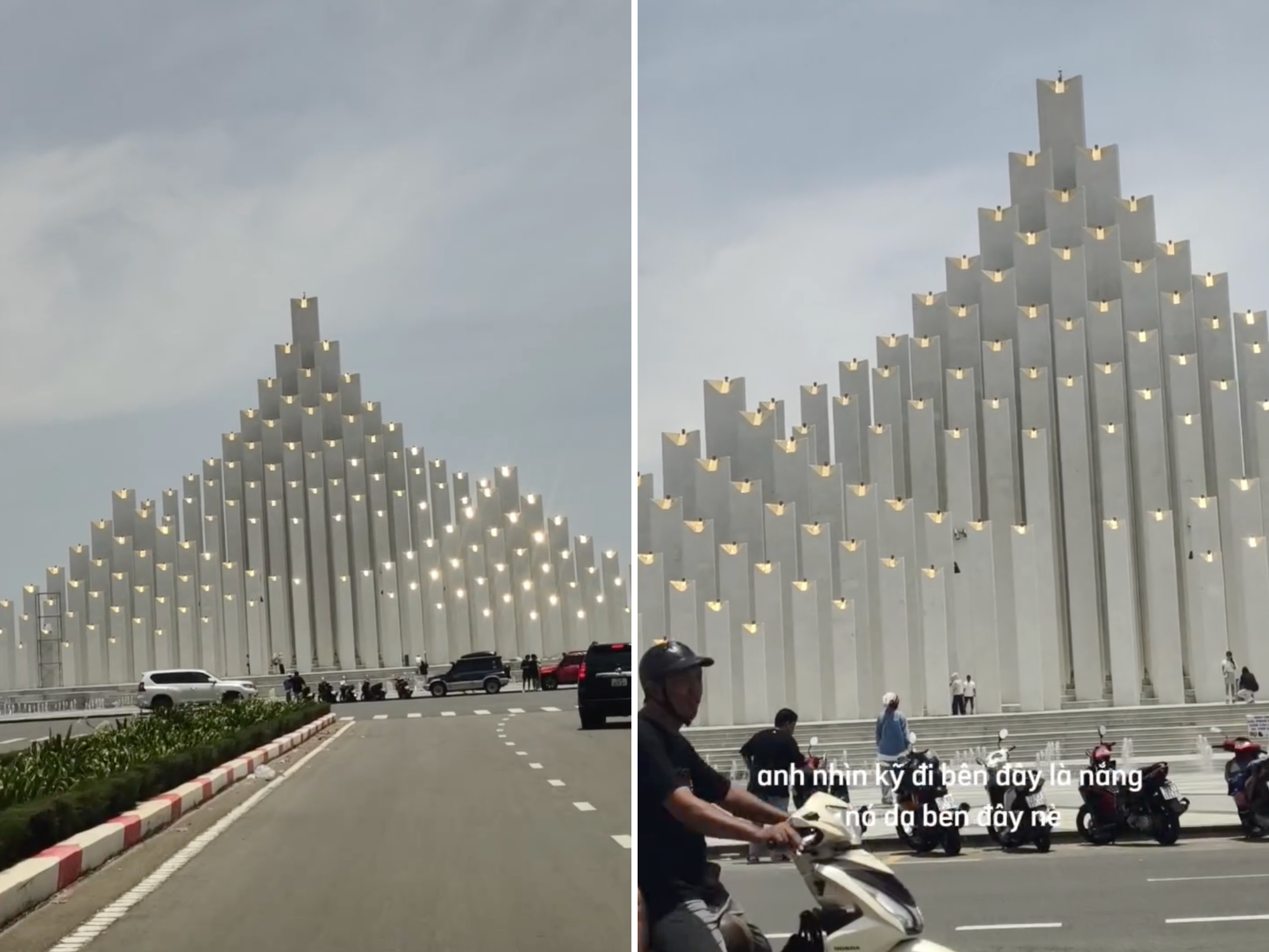 Cụ thể, một cặp đôi đang đi trên xe hơi hướng về phía công trình. Họ bắt đầu bàn luận về việc Tháp Tam Thắng liệu có đang được bật đèn hay không, bởi vì khi nhìn từ xa, ánh sáng phản chiếu từ các trụ tháp tạo ra hiệu ứng thị giác mạnh mẽ như thể có hàng trăm bóng đèn đang sáng rực rỡ dưới cái nắng ban ngày.