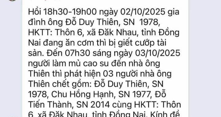 Theo thông tin ban đầu, khoảng 8h sáng 3/10, Công an xã Đắk Nhau, tỉnh Đồng Nai (trước là huyện Bù Đăng, tỉnh Bình Phước) nhận được tin báo từ người dân về việc phát hiện có người chết tại đại lý thu mua nông sản trên địa bàn thôn 6.