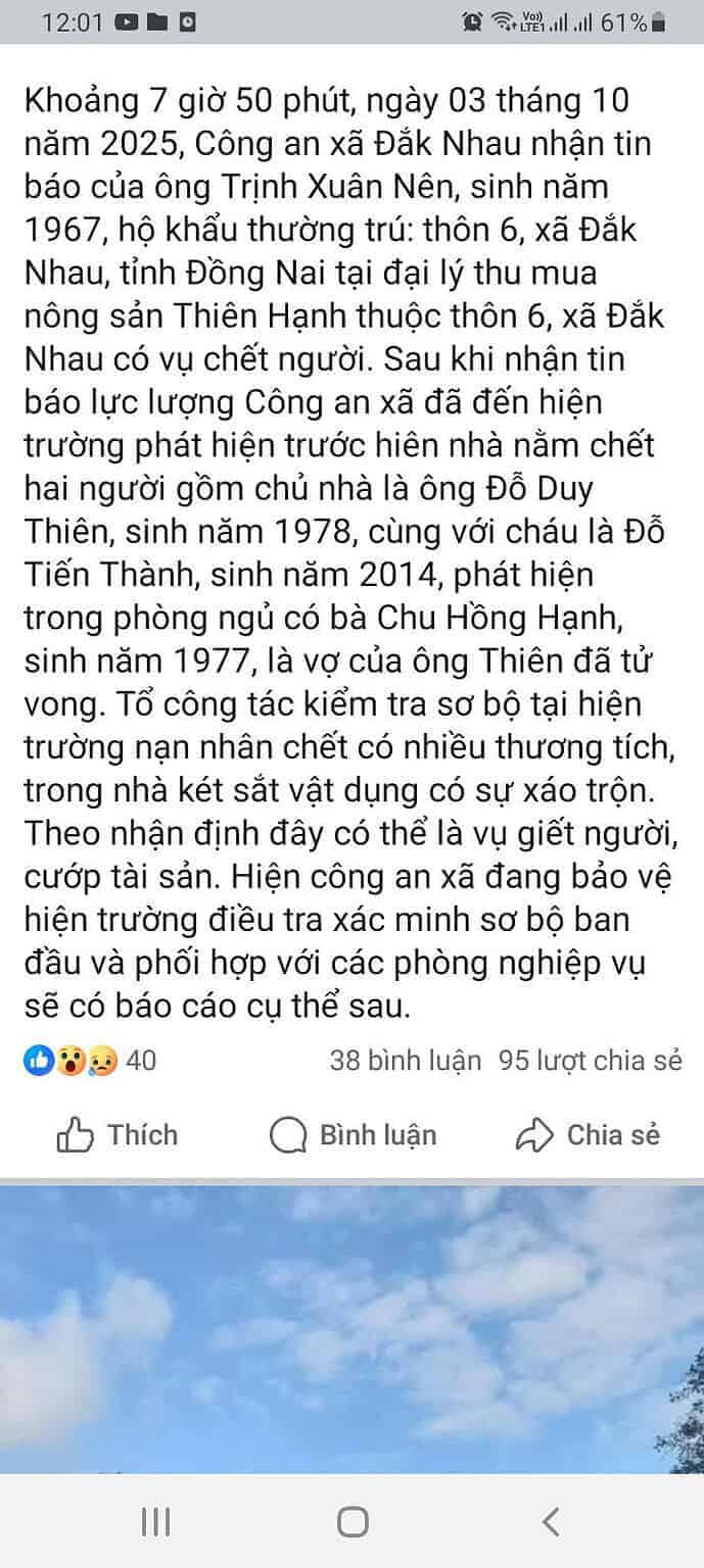 Hiện, công an xã đang bảo vệ hiện trường, phối hợp với các phòng nghiệp vụ của Công an tỉnh Đồng Nai để điều tra xác minh ban đầu.